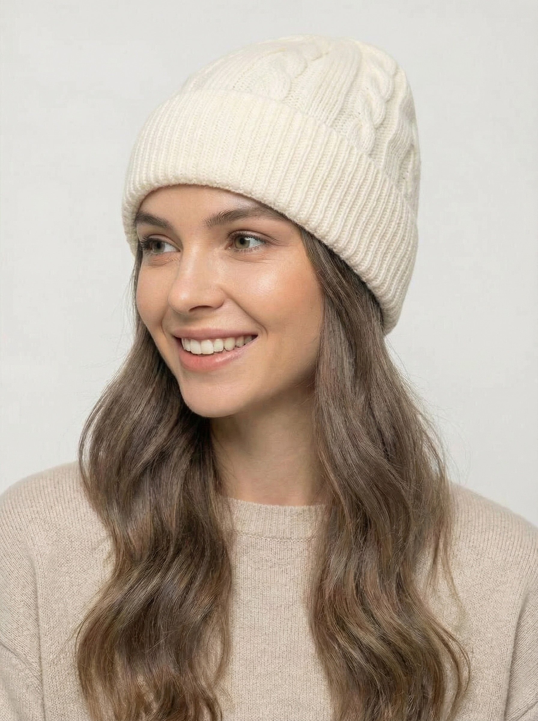 - Laura Beanie (Ivory): A refined, lightweight beanie with a fine ribbed texture. Its clean lines and soft elasticity ensure a comfortable, flattering fit that stays in place all day.